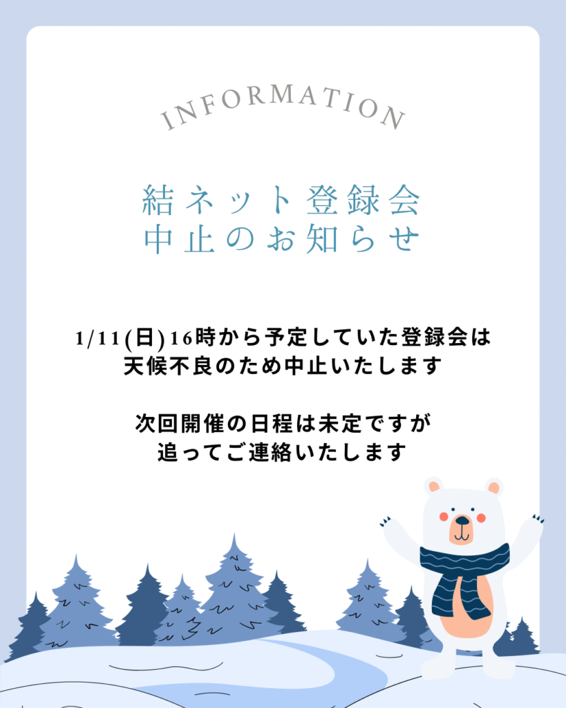 なお、16時より開催予定の結ネット登録会は天候不良のため中止・延期いたします。