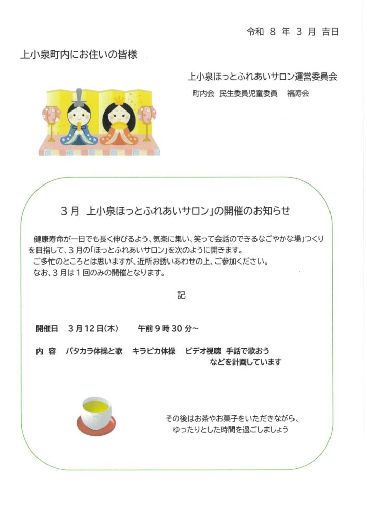 3月ほっとふれあいサロン開催のお知らせ 2026年3月5日 最終更新日時 : 2026年3月5日 kami5123 今月のほっとふれあいサロンの予定です。 上小泉町内会の住民のみなさん、老若男女問わずどなたでもご参加いただけます! みなさまぜひお気軽にご参加ください♪
