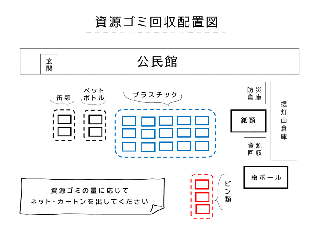 資源ごみ公民館駐車場1,2,3,4,5,6,7,8,9-1,9-2,10,11,13,14,15,16,17-1,17-2