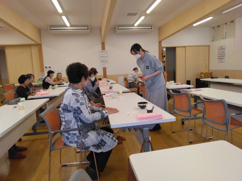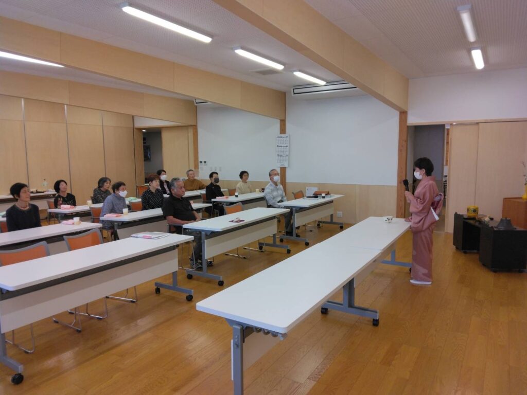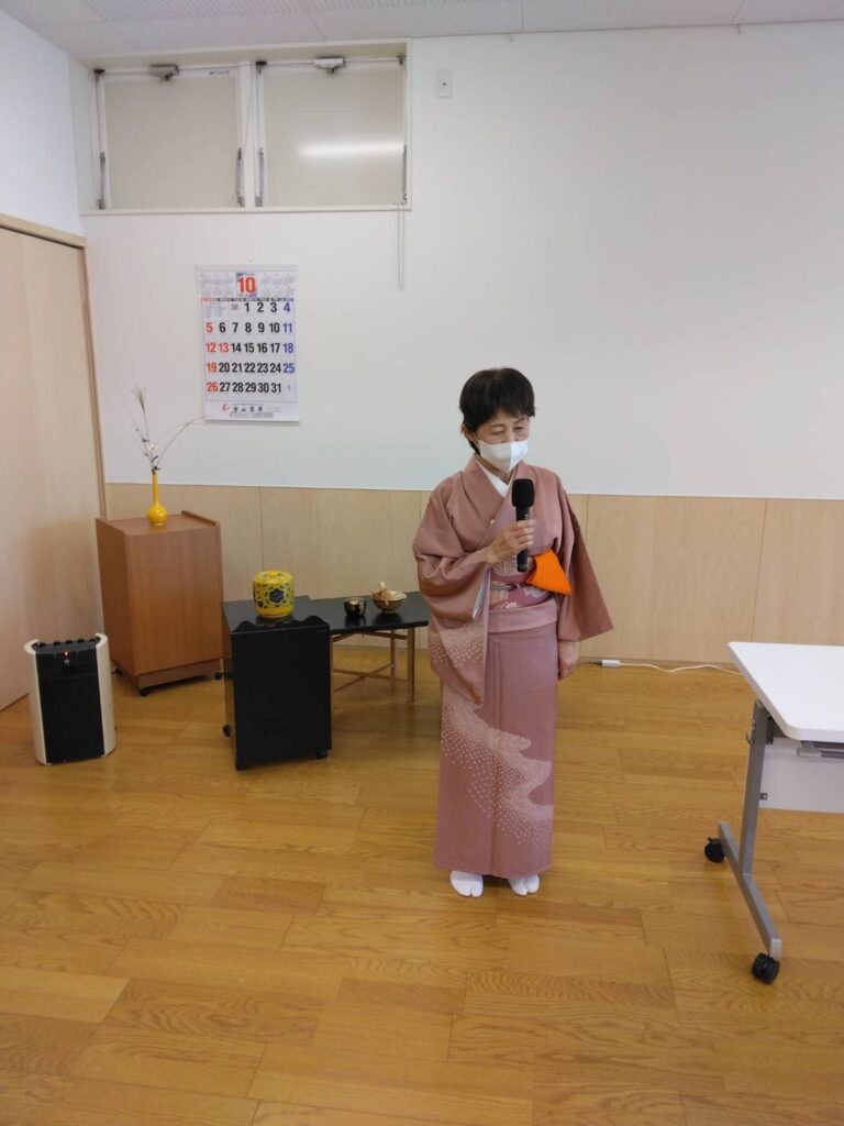 10月9日のサロンでは8班の小澤美知子先生を招いて、「お月見のお茶を楽しもう」と題して、お抹茶とお菓子「秋」をいただきました。