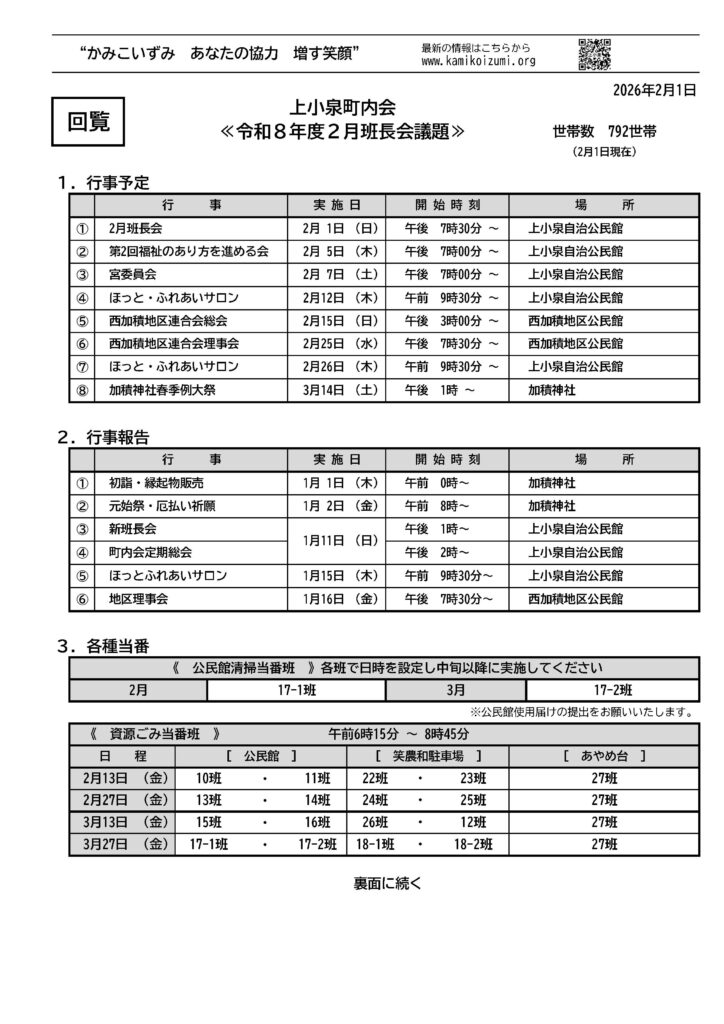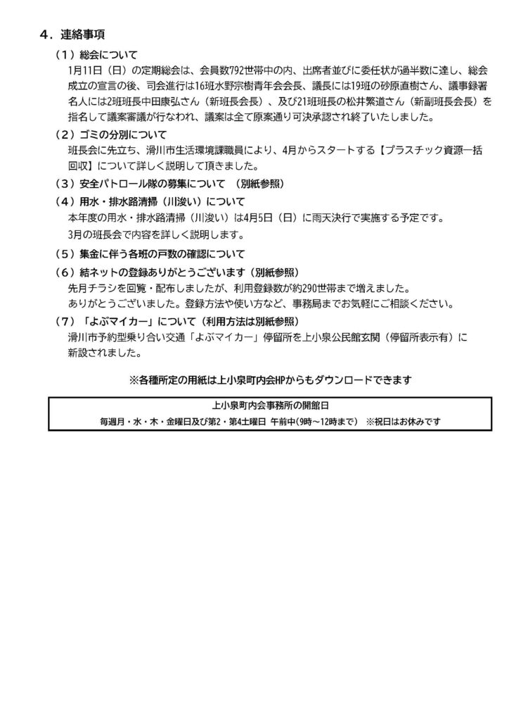 R8年2月班長会を行いました 2026年2月1日 最終更新日時 : 2026年2月1日 ktadm38 2月1日(日)19:30~ 2月度班長会を行いました。 資料ダウンロード R8 2月班長会議事資料 滑川市配布資料はこちらから確認下さい(外部サイト)滑川市広報はこちらから確認下さい(外部サイト)